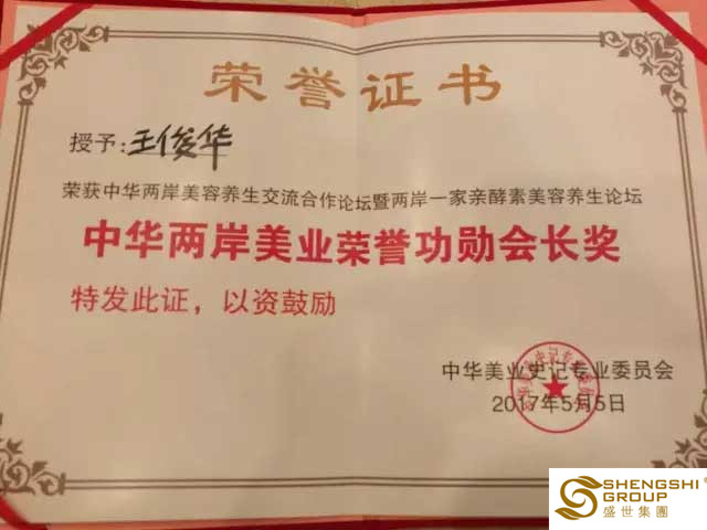 此次聚會,備受美業(yè)關注;眾多美業(yè)大咖齊聚。在美業(yè)伙伴的見證下,盛世集團董事長王俊華女士再次收獲一枚榮譽,其榮獲2017中華兩岸美容養(yǎng)生交流合作論壇暨兩岸一家親酵素美容養(yǎng)生論壇頒發(fā)的中華兩岸美業(yè)榮譽功勛會長獎。