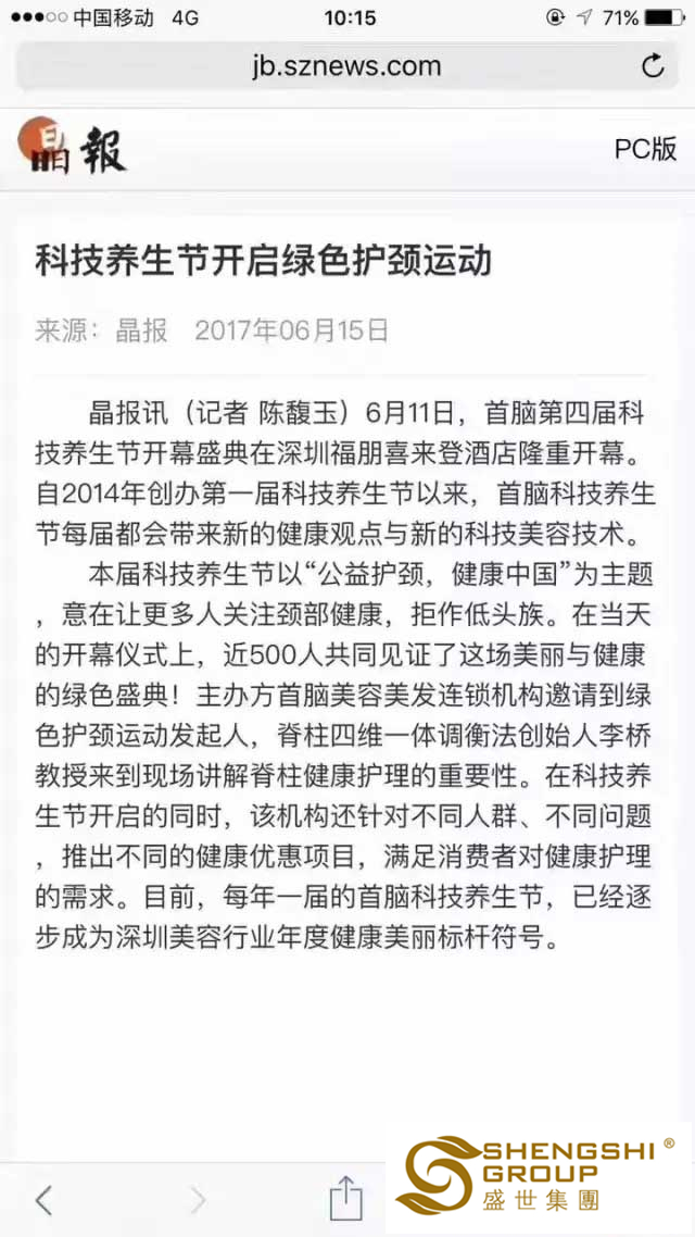 盛世集團(tuán),始終致力為國(guó)民的頸部健康而終生奮斗;未來(lái)的每一天,我們都將繼續(xù)宣傳和倡導(dǎo)【綠色護(hù)頸運(yùn)動(dòng)】;我們永不止步的傳播健康、愛(ài)與希望,致力讓更多的人擁有健康、美麗、自信的人生。