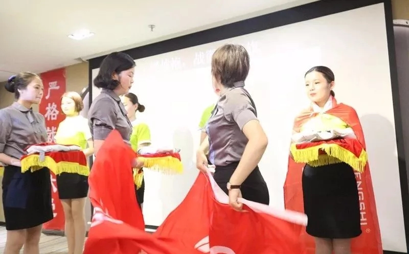 緊接著,臺上的家人們進行了莊嚴的入職宣誓!戰旗披肩,臺上的家人們猶如一個個戰士一般奮勇當先,英姿煥發,宣誓堅定而有力!從此刻起,就成為盛世人了,我們致力把職業當事業,把使命當生命,把信念當信仰,把企業文化深深注入我們的骨子里,我們的血液里,并為我們共同的夢想而終身奮斗!